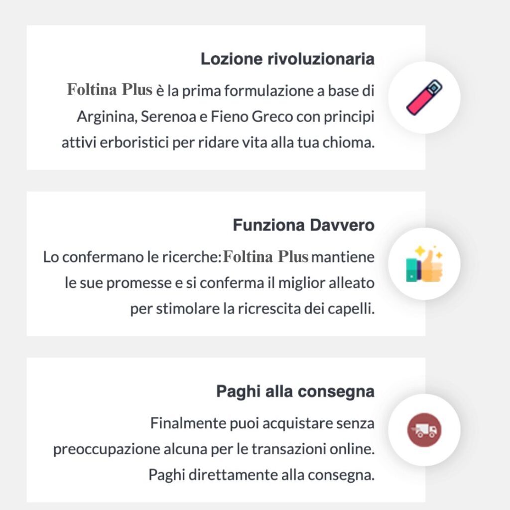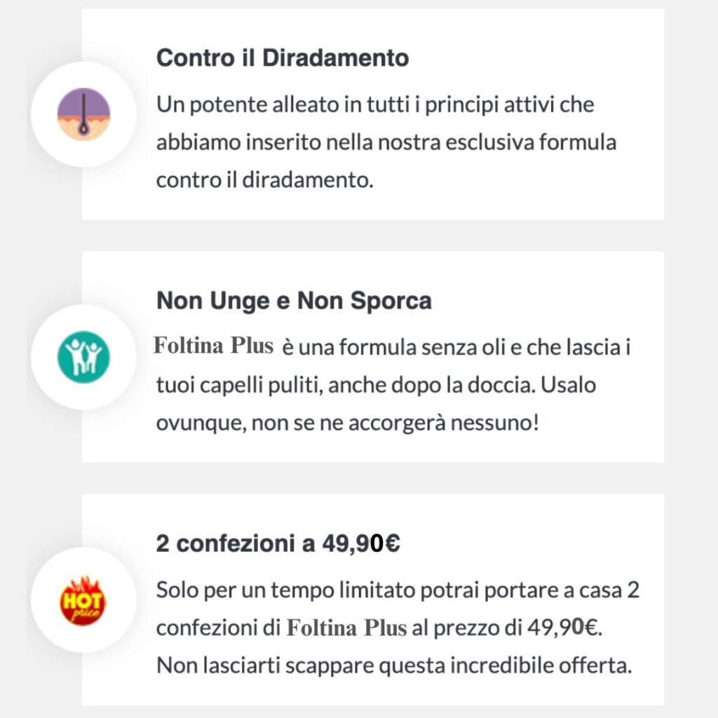 Foltina Plus ti permette di ottenere una chioma più sana, forte e folta, senza ricorrere a costosi e dolorosi trattamenti chirurgici. Con l’uso regolare, i risultati saranno visibili in brevissimo tempo, senza complicazioni o effetti collaterali.